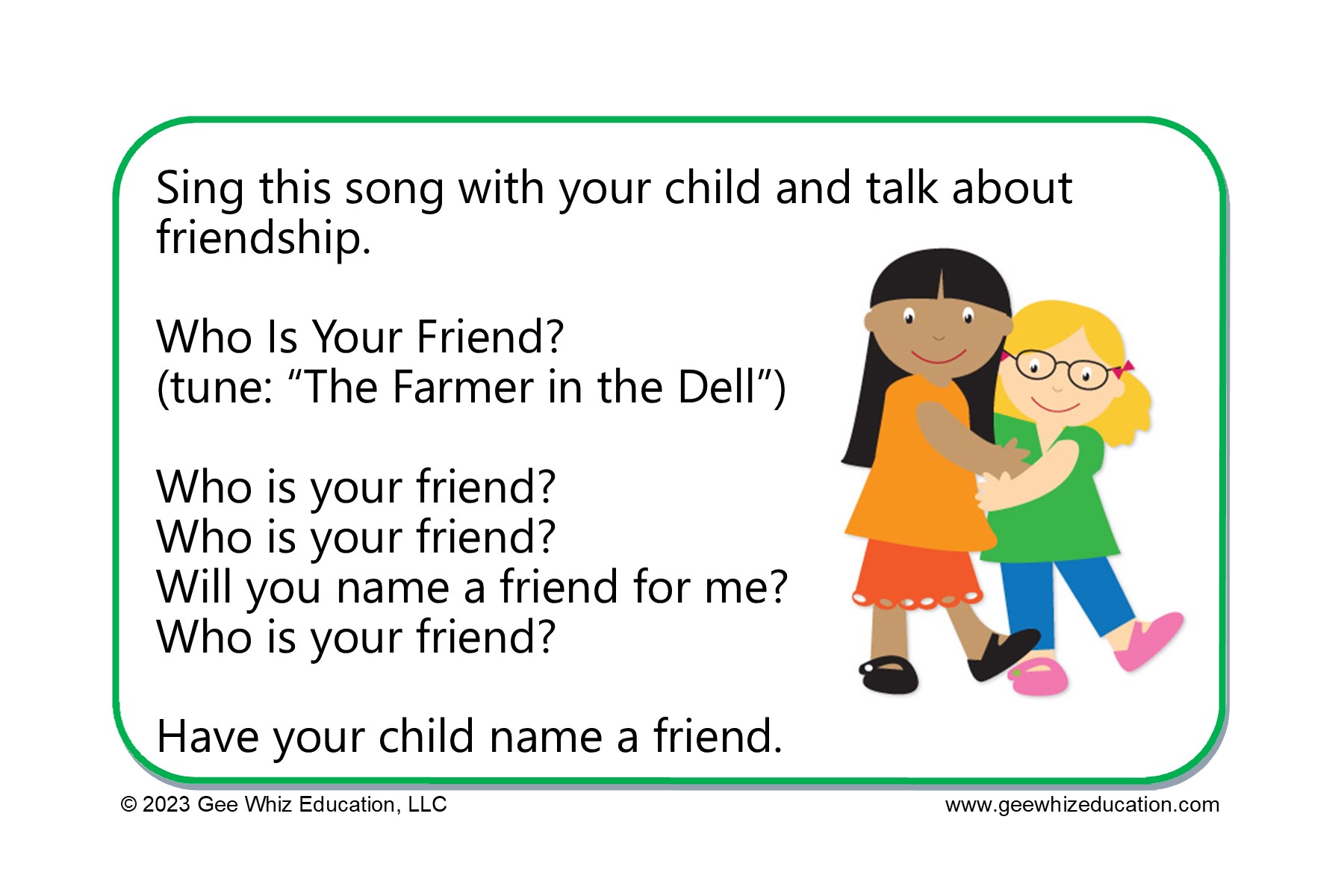 Friends. They are such an important part of a child’s life. Learning what it means to be a good friend and ways you can make new friends are important social skills for children to learn. Our next unit, “Friendship Fun” will provide you with numerous activities that help children build skills in these areas. Because new children can join the program at any time, these experiences can be repeated throughout the year. Be sure to incorporate the children’s ethnic and family backgrounds into this unit as much as possible. This is meaningful way for them to learn more about diversity.