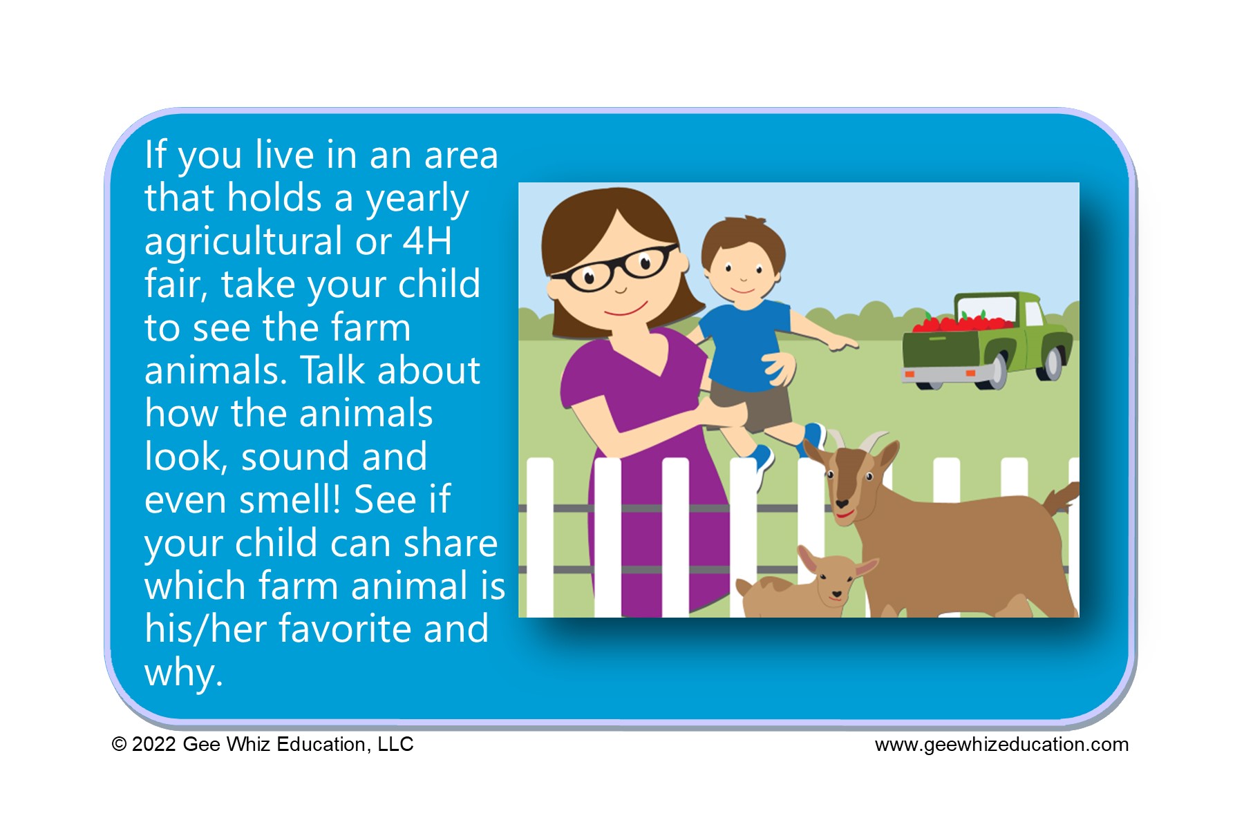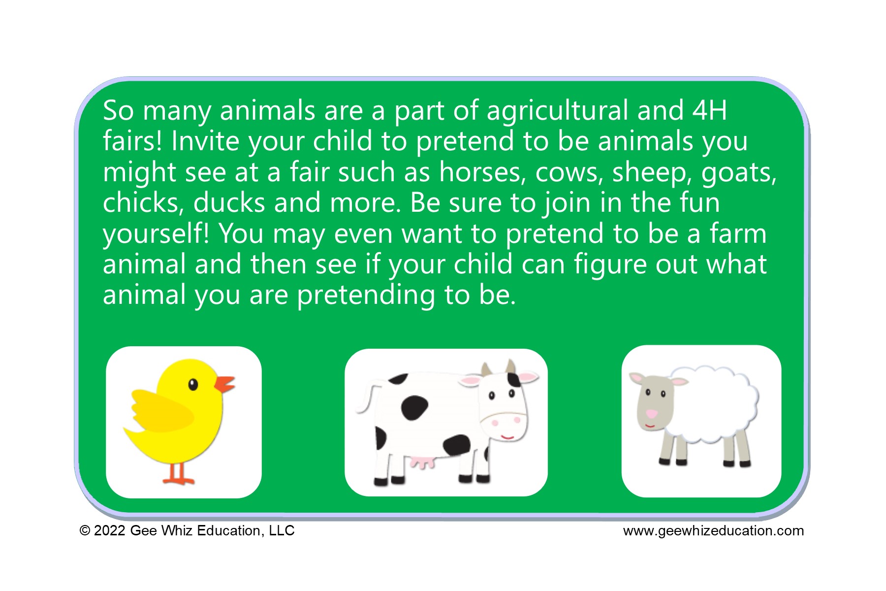 What is your favorite part of the fair? The animals? The food? The rides? These are just a few of the questions the children will answer during our next unit, “Fun At the Fair” During this unit, the experiences and activities will focus on agricultural fairs (e.g., 4H fairs/county fairs). Keep in mind that some children may not have experience with an agricultural fair. If this is the case for your group, you might want to start the unit with a short video such as this one: https://www.youtube.com/watch?v=gGDHtH52PLk. If you choose to show this video, be sure to point out and read the text on the screen as it appears. If you happen to live in an area where this type of fair takes place, be sure to encourage the children to share their experiences. You will also want to have plenty of books available as well as videos to help children build background knowledge about this topic.